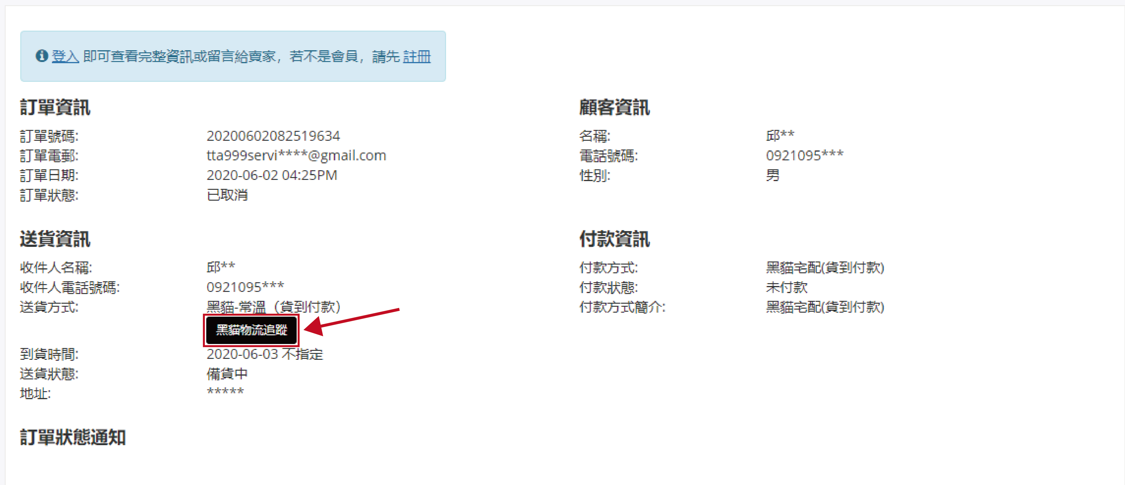 3.進入到訂單資訊、送貨資料在系統查詢包裹: