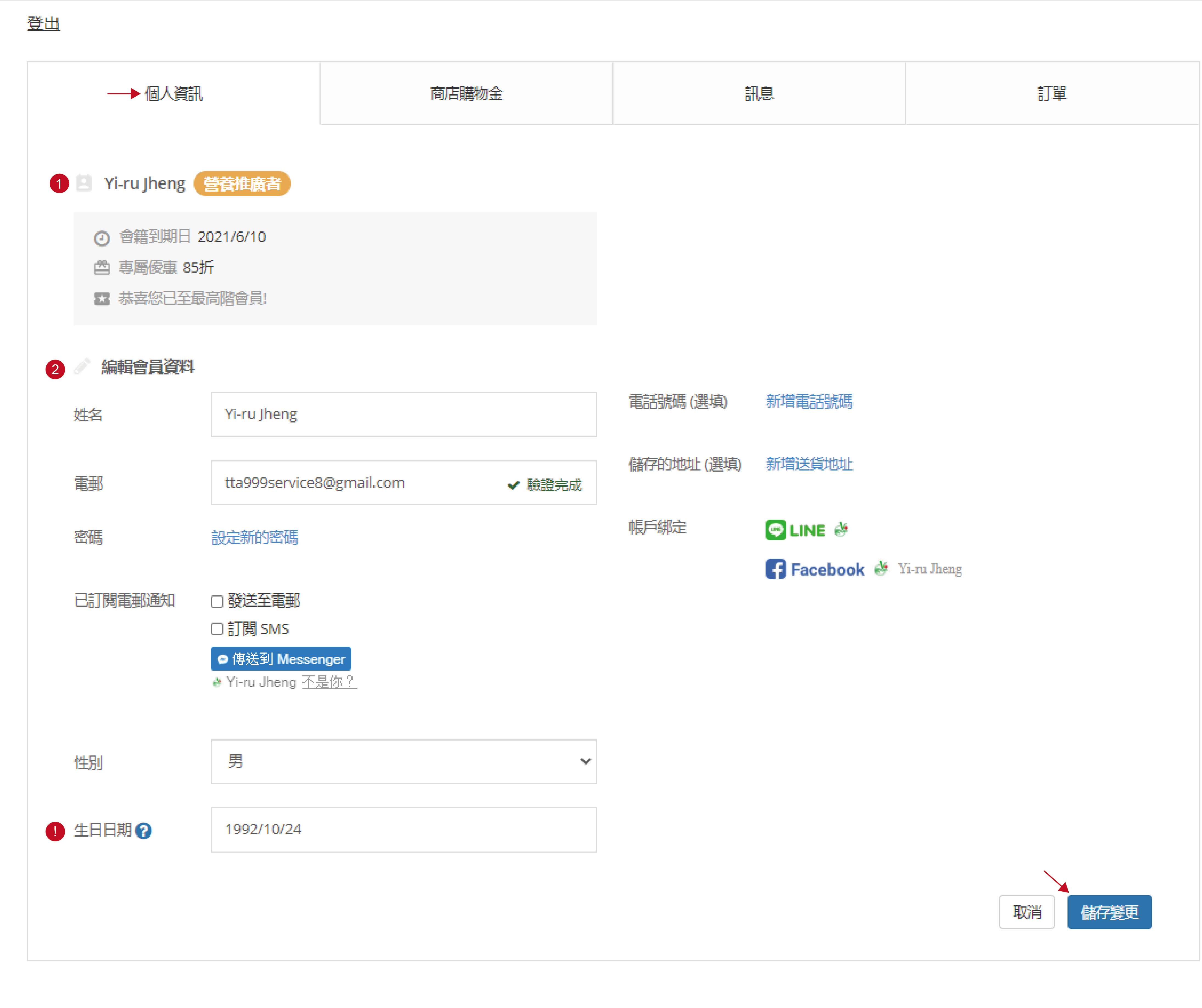 (2)編輯會員資料 — 若是需要編輯個人資料(如姓名、電話、Email、密碼、配送地址),也可以在這個頁籤完成,修改後記得按下儲存變更喔!