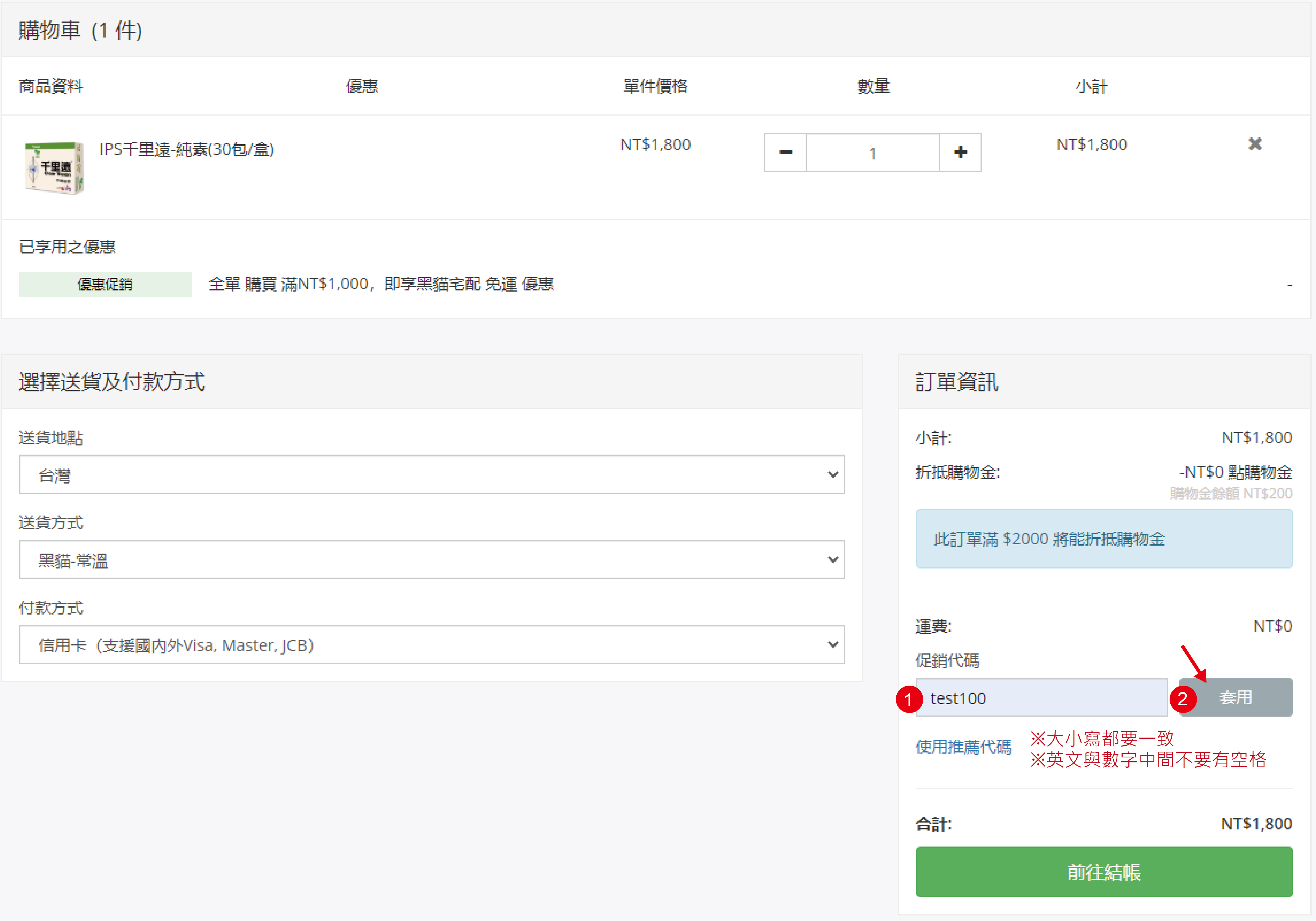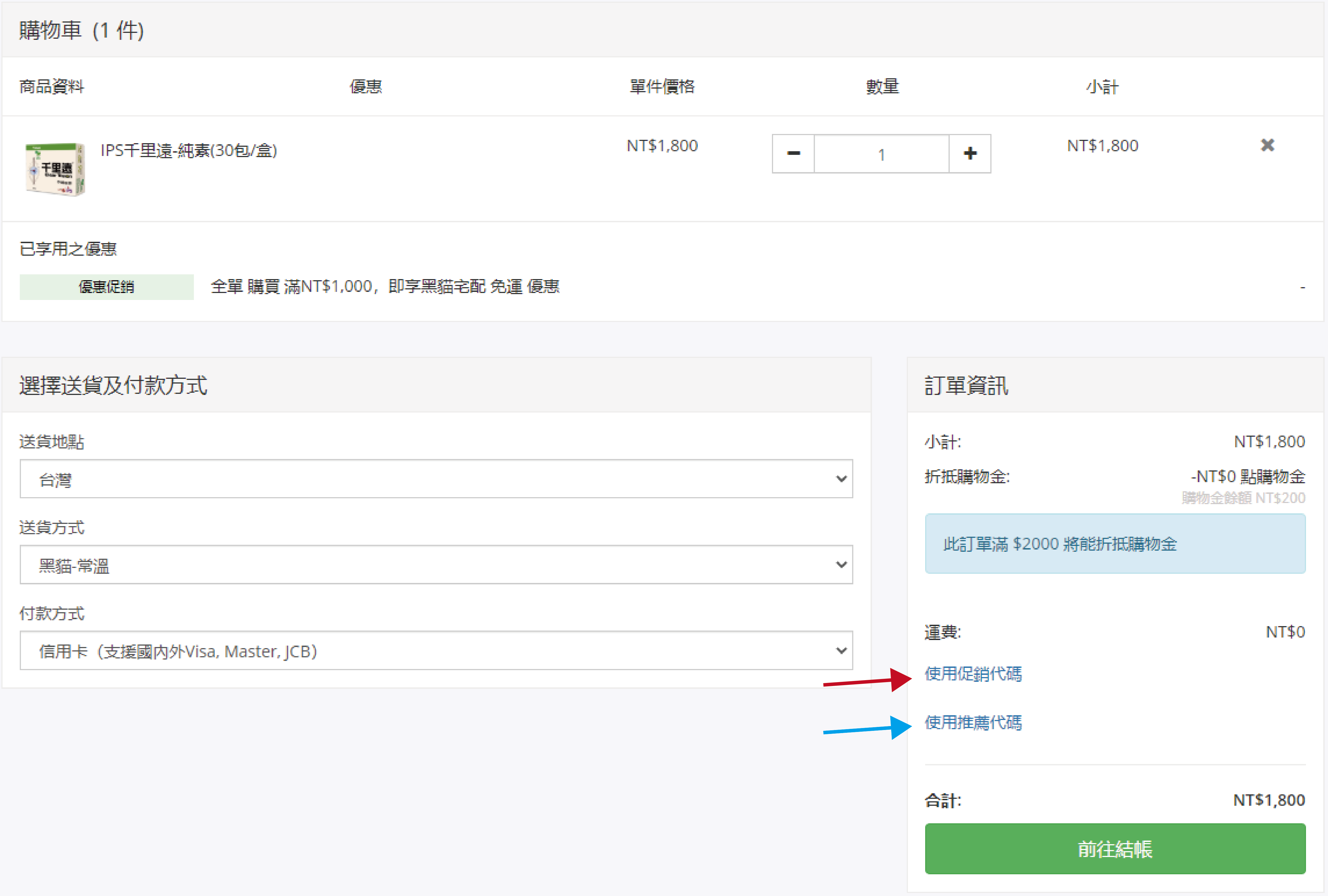 1.在購物車畫面的訂單資訊,點擊 使用優惠代碼