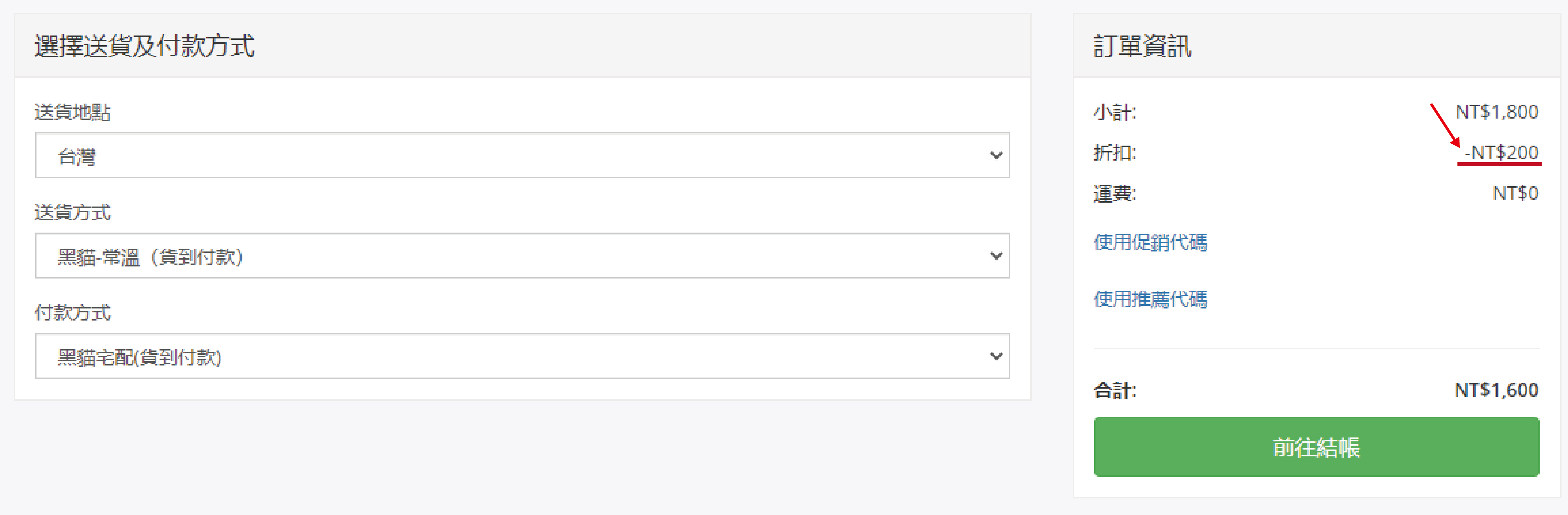 3.折扣成功,於訂單資訊的折扣欄位會顯示已折扣金額