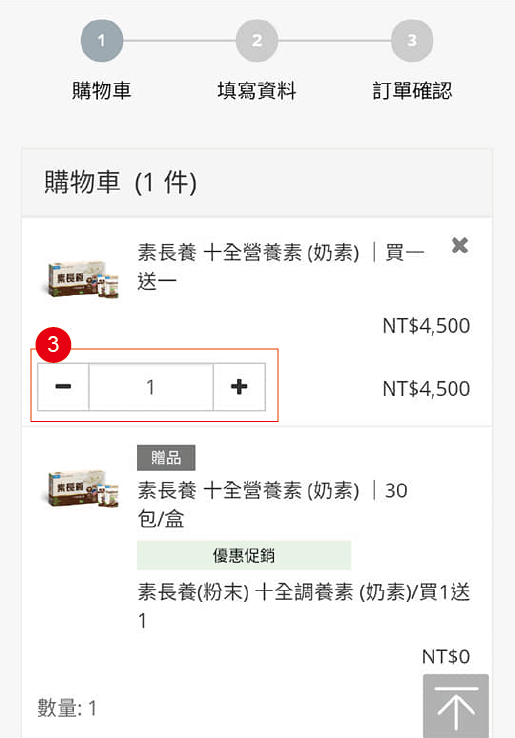 3.於購物車調整商品數量,欲增加數量點擊+、減少數量點擊 −