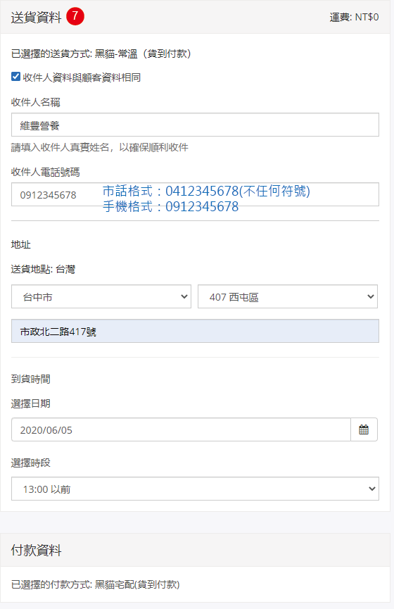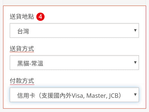 4.於同一頁面,選擇送貨及付款方式,送貨方式分為『黑貓-常溫、黑貓-常溫(貨到付款)』,付款方式分為『黑貓-常溫(貨到付款)、信用卡國內外 Visa、MasterCard、JCB 』