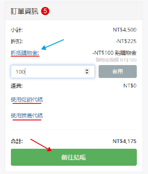 5.若是有優惠代碼、購物金(需登入會員),也請於此畫面輸入確認以上資訊後,點下前往結帳,將會前往顧客資料與送貨資料填寫頁面。