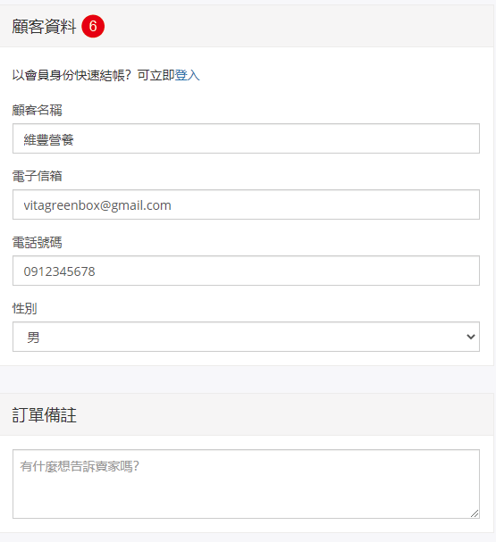 6.先填寫顧客資料(除訂單備註,所有欄位皆為必填)