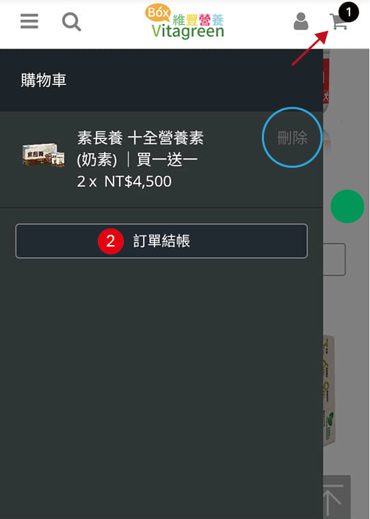 2.可以看到已經加入購物車的品項(如下圖),藍圈處按圖示可以刪除不需要的品項,箭頭處為購物車數量,點選「訂單結帳」可前往結帳頁面,點選灰色塊綠色圓圈處即可返回繼續瀏覽,即可前往購物車調整數量、選擇送貨及付款方式。