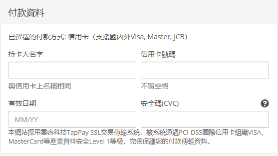 ▶︎▶︎信用卡付款:於填寫資料頁面填寫信用卡資訊。確認資料無誤後,點下提交訂單,即會前往信用卡付款畫面。
