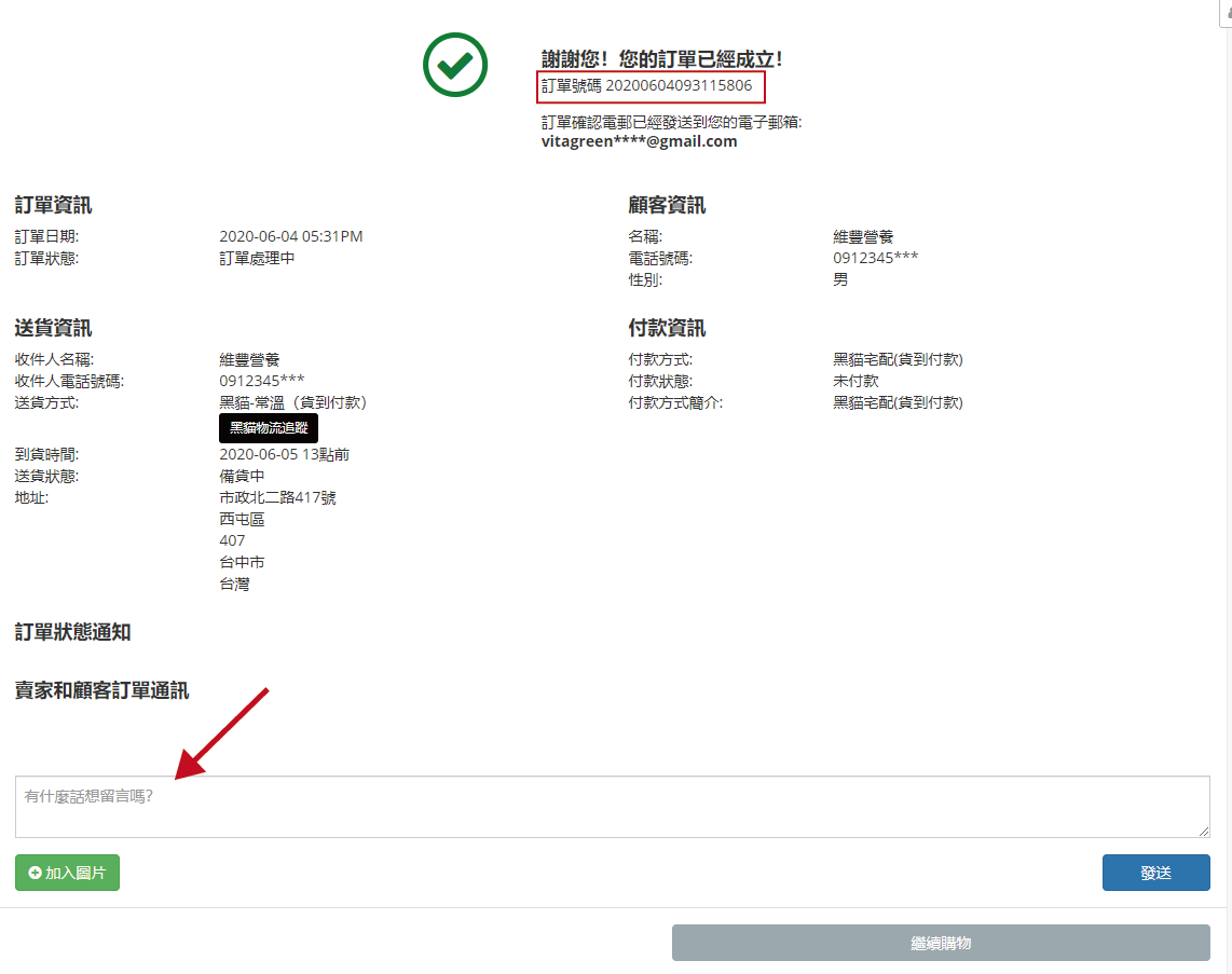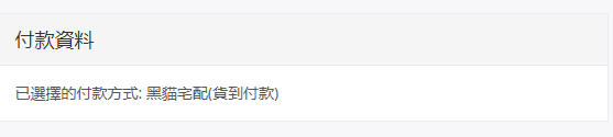 ▶︎▶︎黑貓(貨到付款):如選擇黑貓(貨到付款)無須填寫資料頁面。確認資料無誤後,點下提交訂單,即會完成訂單畫面。