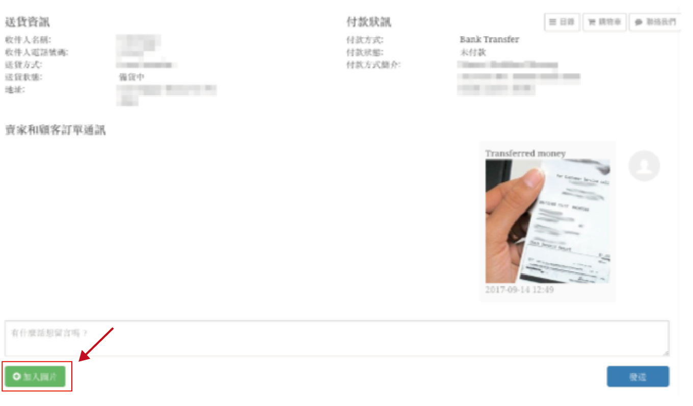 4. 點入「訂單連結」之後,請點選『加入圖片』上載收據及留言通知店家已經匯款