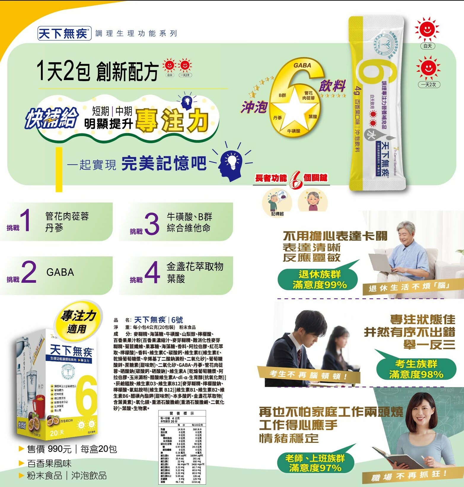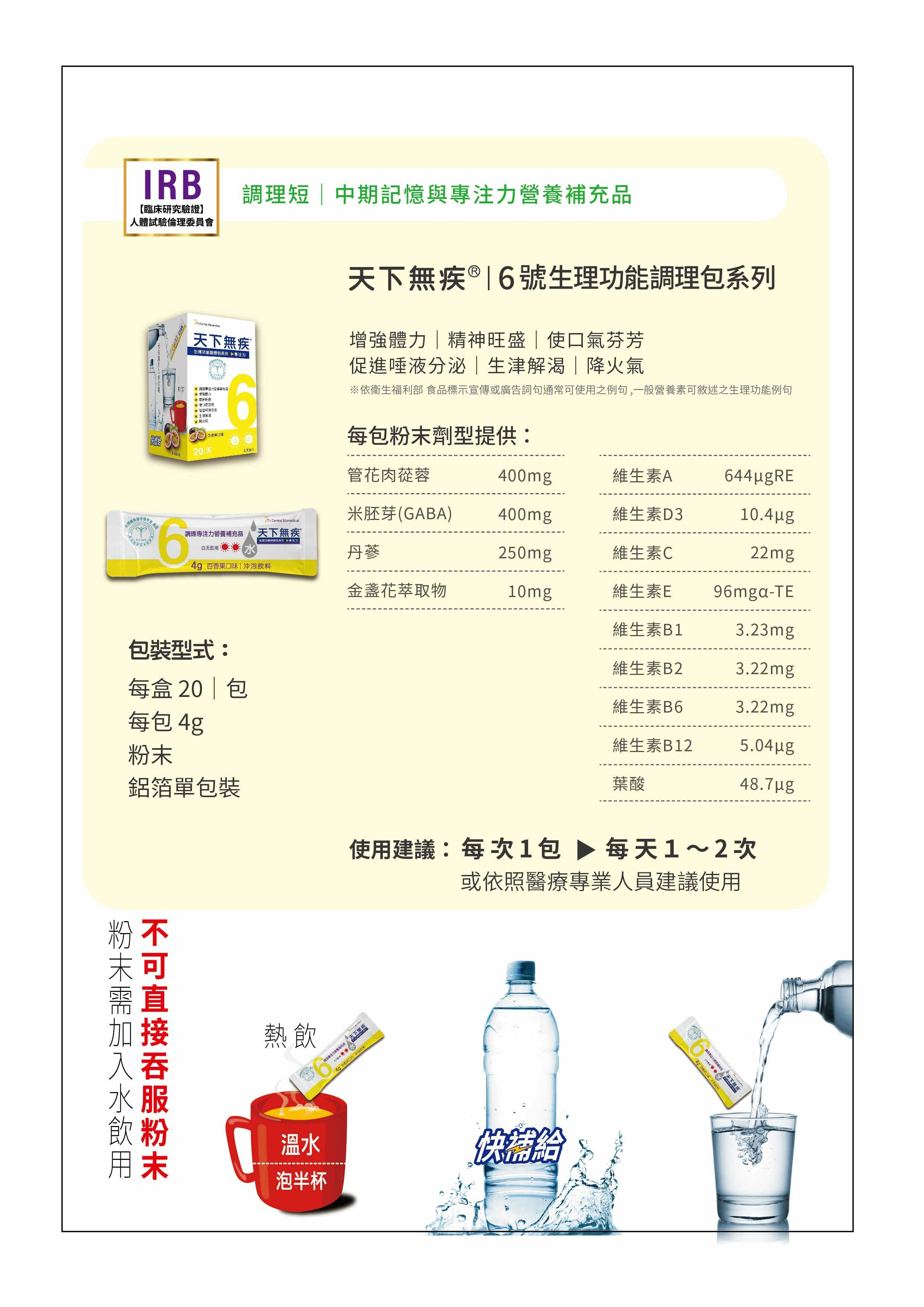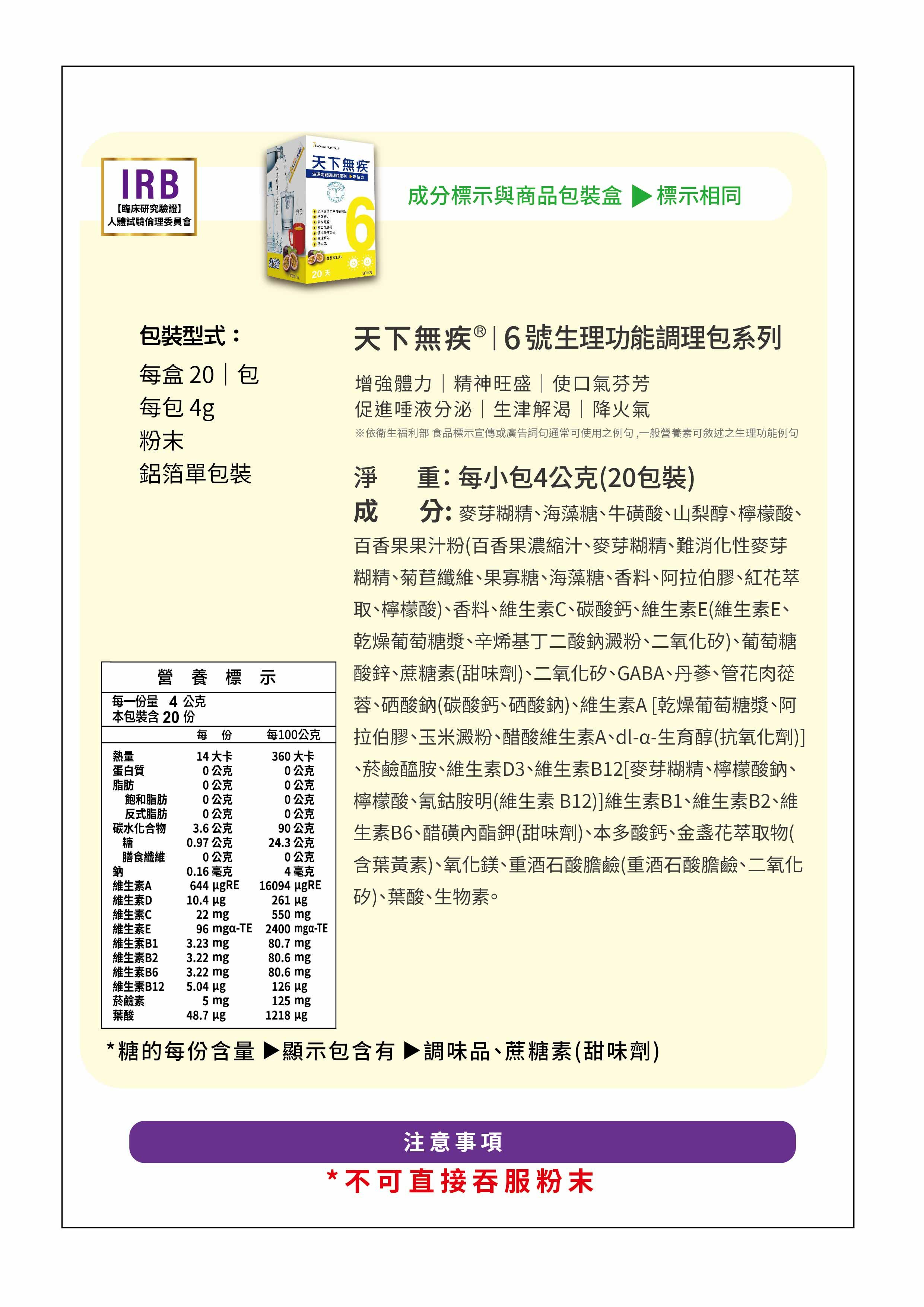 不管是工作繁忙還是日常生活中感覺疲憊,來一包天下無疾 6號調理包,讓你瞬間恢復精神,元氣滿滿!😍