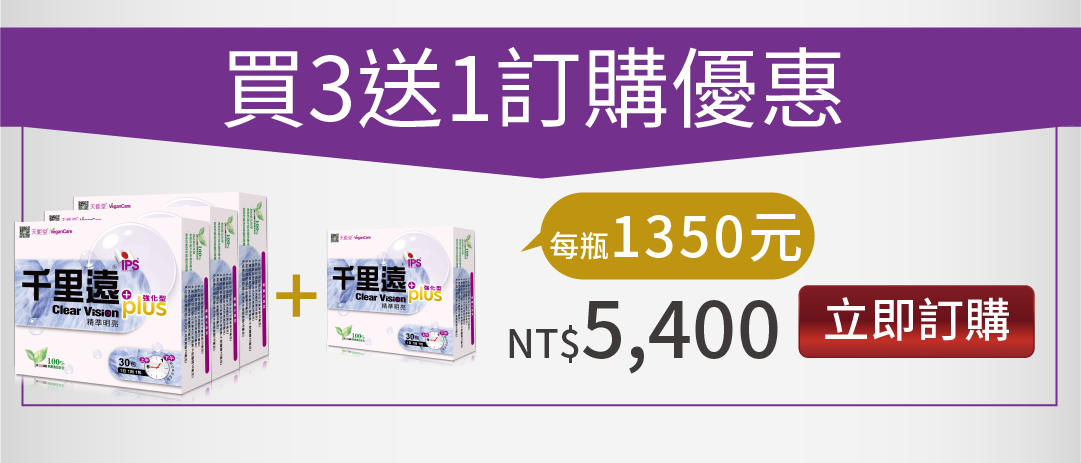享買3送1優惠!千里遠給你優質舒適營養配方,鑽石級守護配方黑豆萃取物IPS,獨家專利配方,葉黃素、多醣體、蝦紅素、花青素、藍莓萃取物、維生素A,每天只要1包。