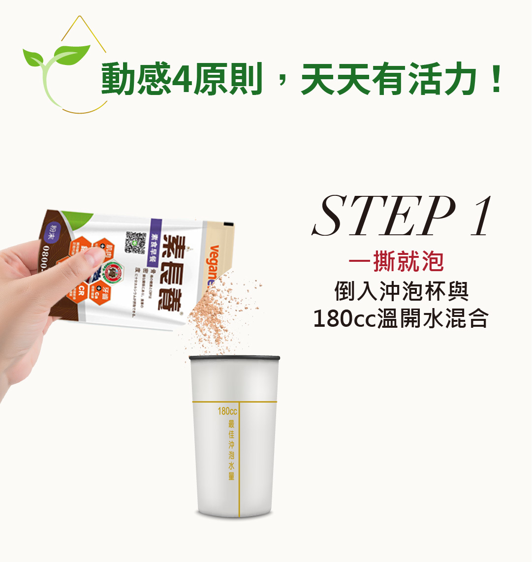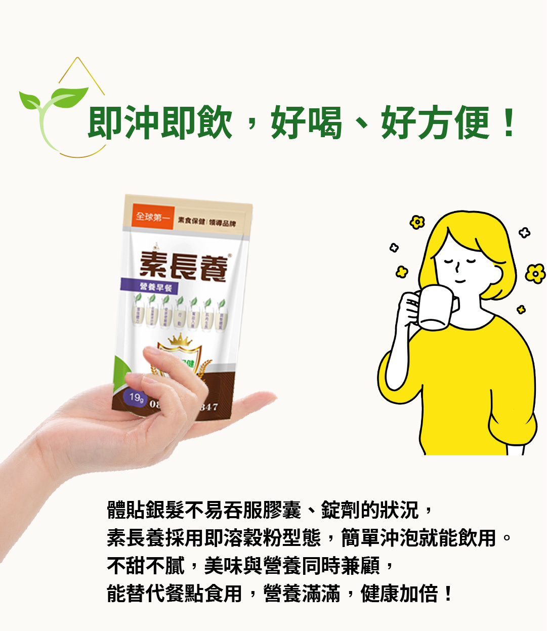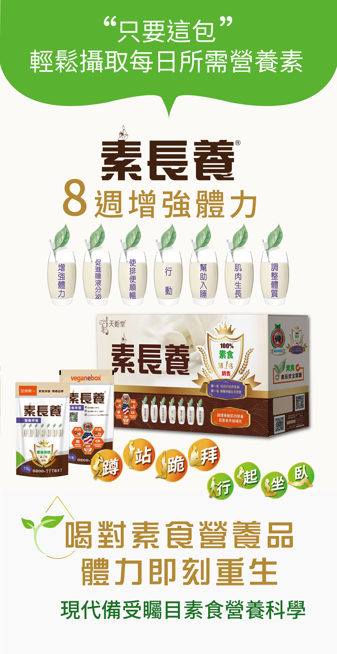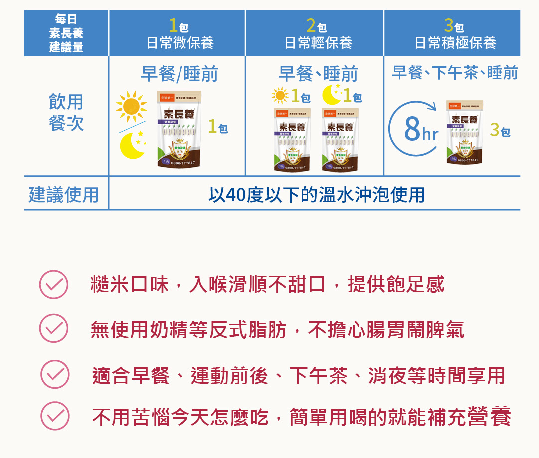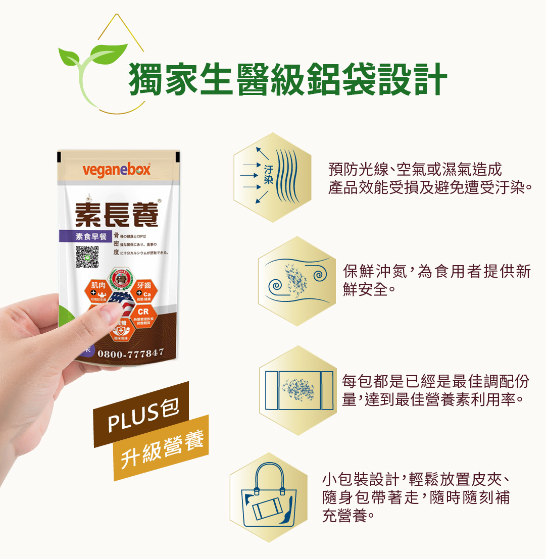 給茹素者多方的營養輔助,不易攝取到的七大營養素簡單吸收,每天一包提供蛋白質、鈣、B12、D2等活力營養素,用喝得,體力更有勁。