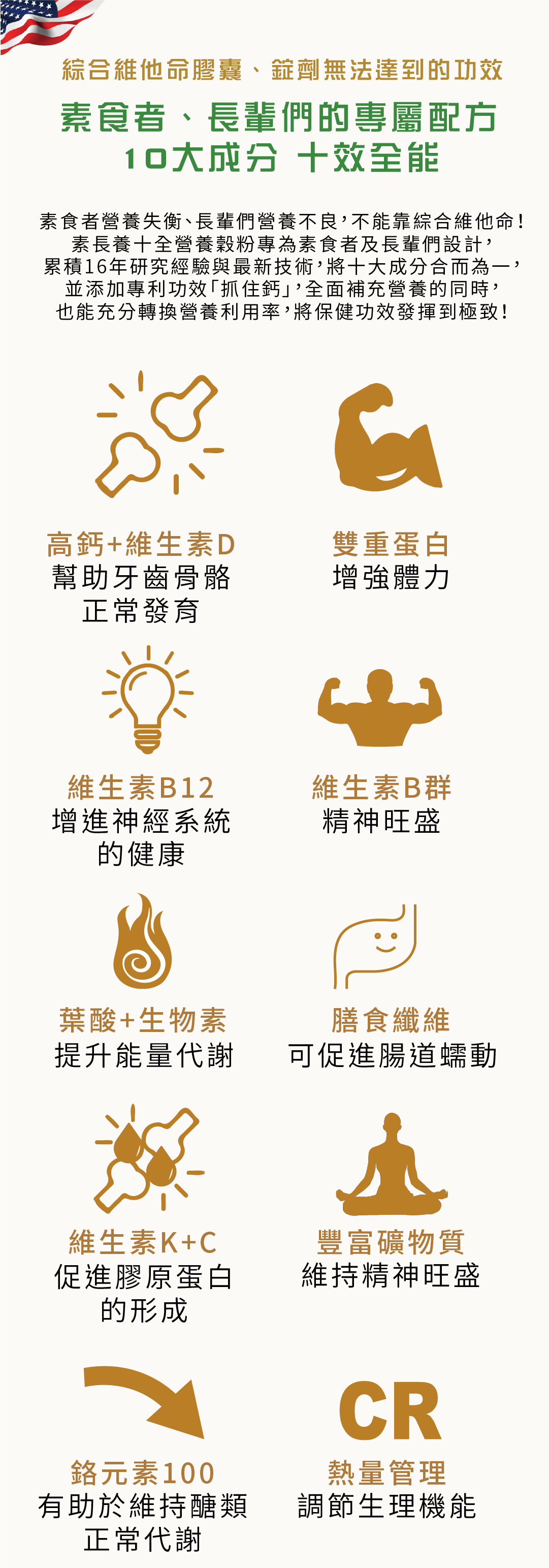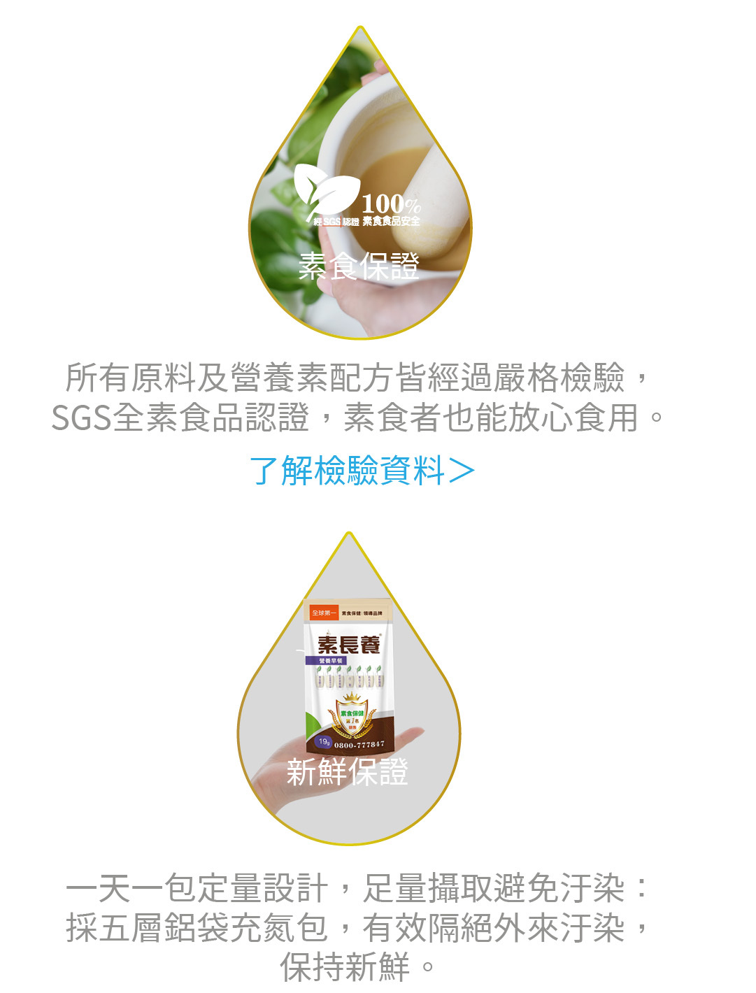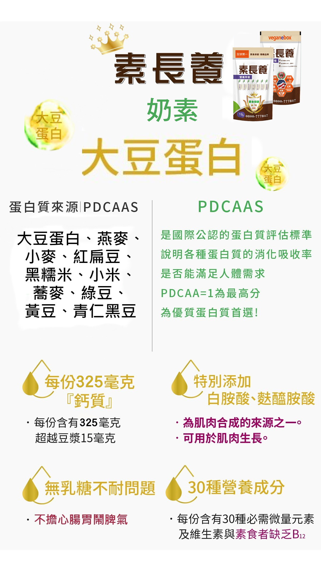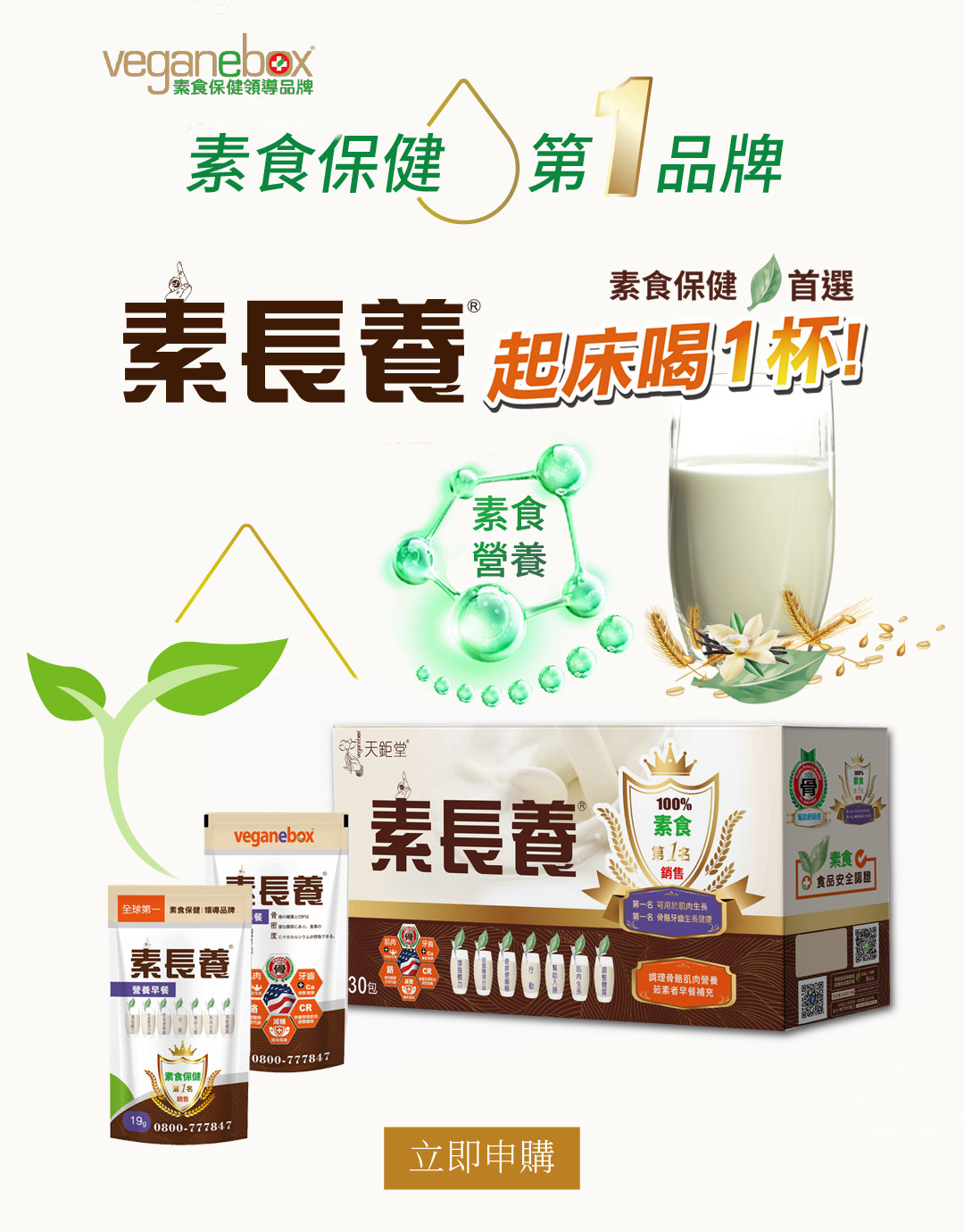 給茹素者多方的營養輔助,不易攝取到的七大營養素簡單吸收,每天一包提供蛋白質、鈣、B12、D2等活力營養素,用喝得,體力更有勁。