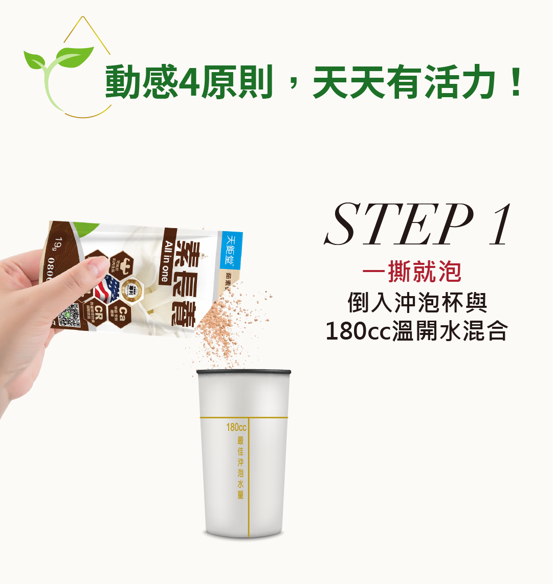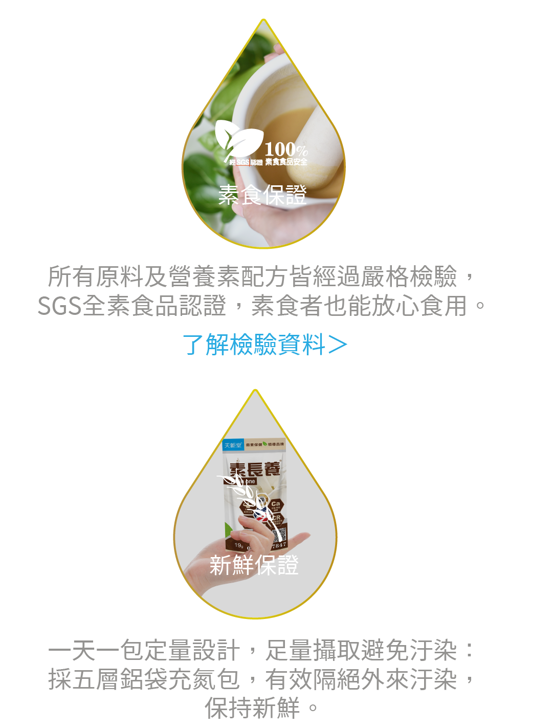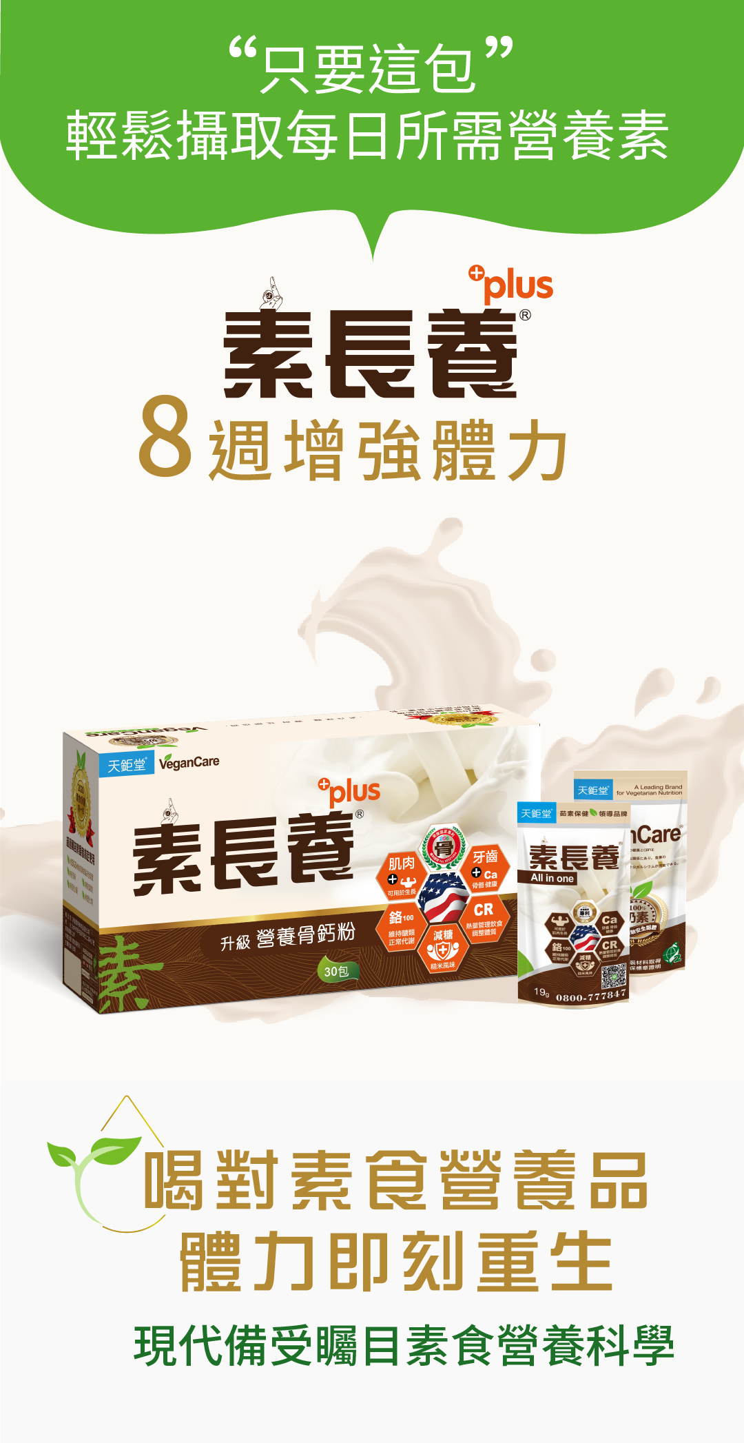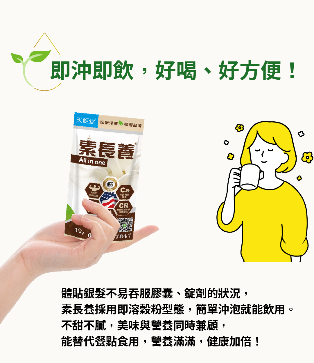 素長養|給茹素者多方的營養輔助,不易攝取到的七大營養素簡單吸收,每天一包提供蛋白質、鈣、B12、D2等活力營養素,用喝得,體力更有勁。